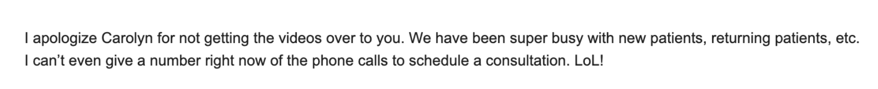 Carolyn and her team have been AMAZING! We have been overwhelmed with new patient bookings and returning patients that we haven't seen in a year! I can't even give a number right now because we have been so busy. Every patient that comes in from the ads is HIGH QUALITY and signs up after our consultation. I still need to do a testimonial video for you because you are the ABSOLUTE BEST!